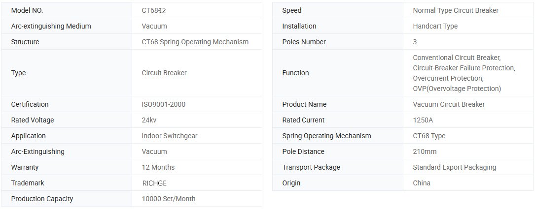 Model CT68-12 panloob na vacuum circuit breaker gamit ang mekanismo ng operating ng tagsibol. Ito ay three-phase AC, 50 Hz panloob na kagamitan sa pamamahagi ng kuryente na may boltahe ng 12KV, higit sa lahat na ginagamit sa mga ipinamamahaging sistema ng kuryente, mga mina, petrolyo, industriya ng kemikal, metalurhiya, konstruksyon, transportasyon, mga minahan ng karbon at munisipyo, pati na rin sa mga suplay ng kuryente at pamamahagi ng mga gusali ng lunsod o bayan at mga pampublikong pasilidad at iba pang mga lugar. Ito ay malawakang ginagamit upang maprotektahan ang mga kagamitan sa kuryente na may mataas na boltahe mula sa sobrang kasalukuyang, short-circuit, under-boltahe at over-boltahe, at maaaring maaasahan na ginagarantiyahan ang ligtas na operasyon ng mga kagamitan sa kuryente.Ang circuit breaker ay nagtatampok ng isang modular na disenyo, kung saan ang mekanismo ng operating at ang circuit breaker body ay naghihiwalay, na nagpapahintulot sa mabilis na mga kapalit at pagpupulong.