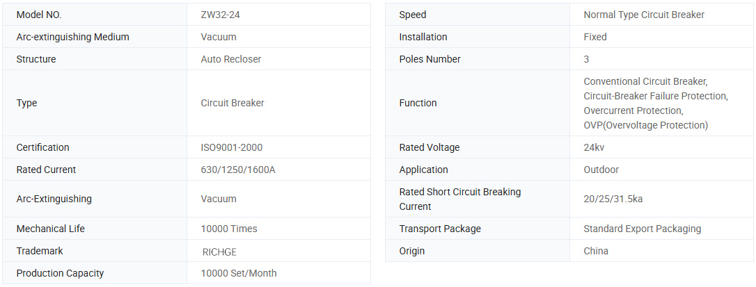 Ang ZW32-24 panlabas na AC high-boltahe vacuum circuit breaker (mula rito ay tinukoy bilang circuit breaker) ay na-rate na boltahe ng 24KV, 50Hz three-phase AC panlabas na kagamitan sa pamamahagi ng kapangyarihan.