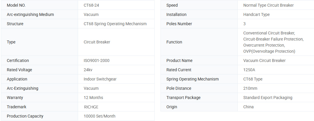 Model CT68 -24 panloob na vacuum circuit breaker gamit ang mekanismo ng operating ng tagsibol. Ito ay three-phase AC, 50 Hz panloob na kagamitan sa ditribution na may lakas na may boltahe na 24KV.