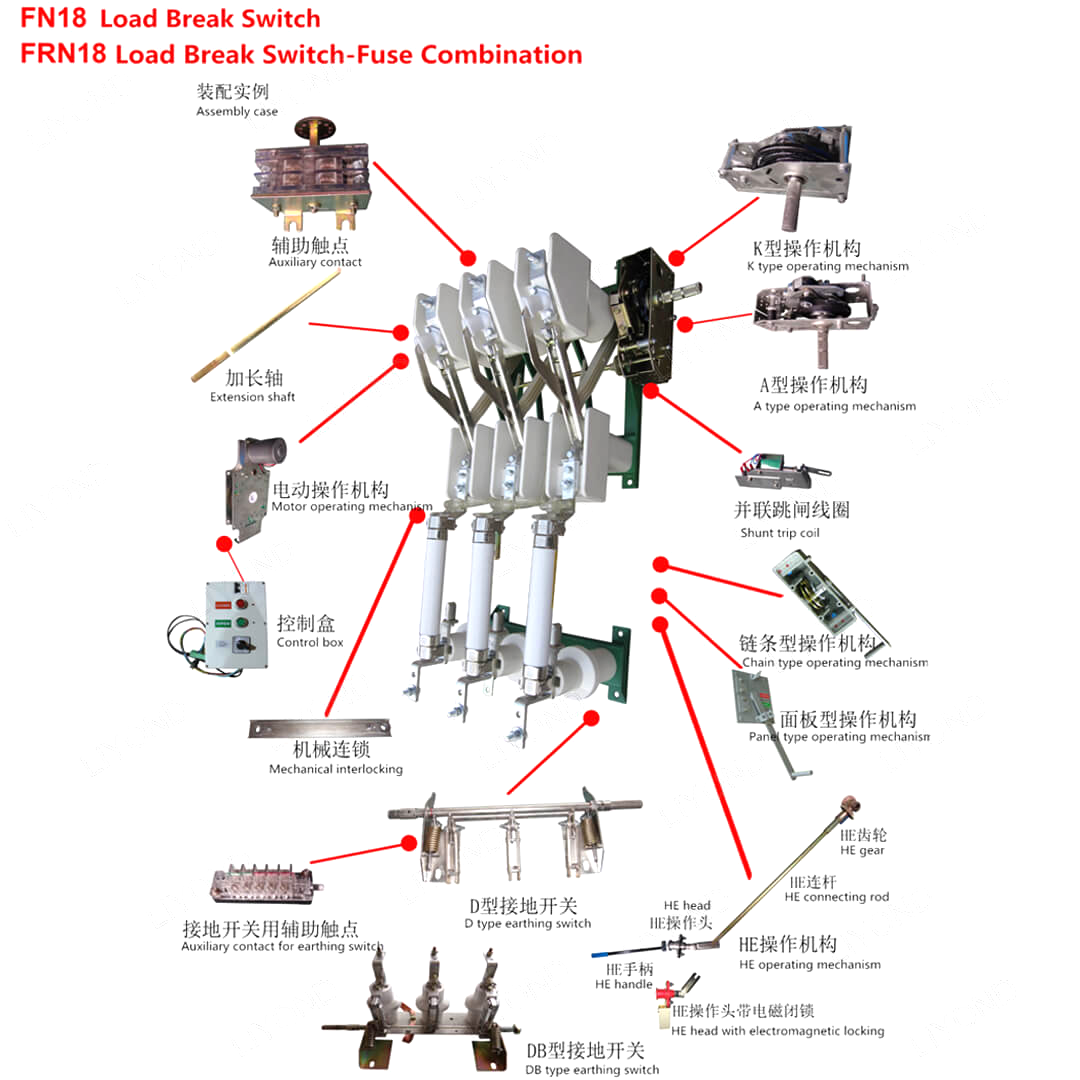 Ang karaniwang switch ng FN18 ay nagsasama ng isang mabibigat na bakal na frame na may stand-off na mga insulators, isang natatanging sistema ng pag-iwas ng puffer-type na arc, isang mekanismo ng operating at kasalukuyang mga nagdadala ng mga sangkap, kabilang ang mga nakakaintriga na uri ng blade na may mga bisagra ng cast at mga konektor ng panga.