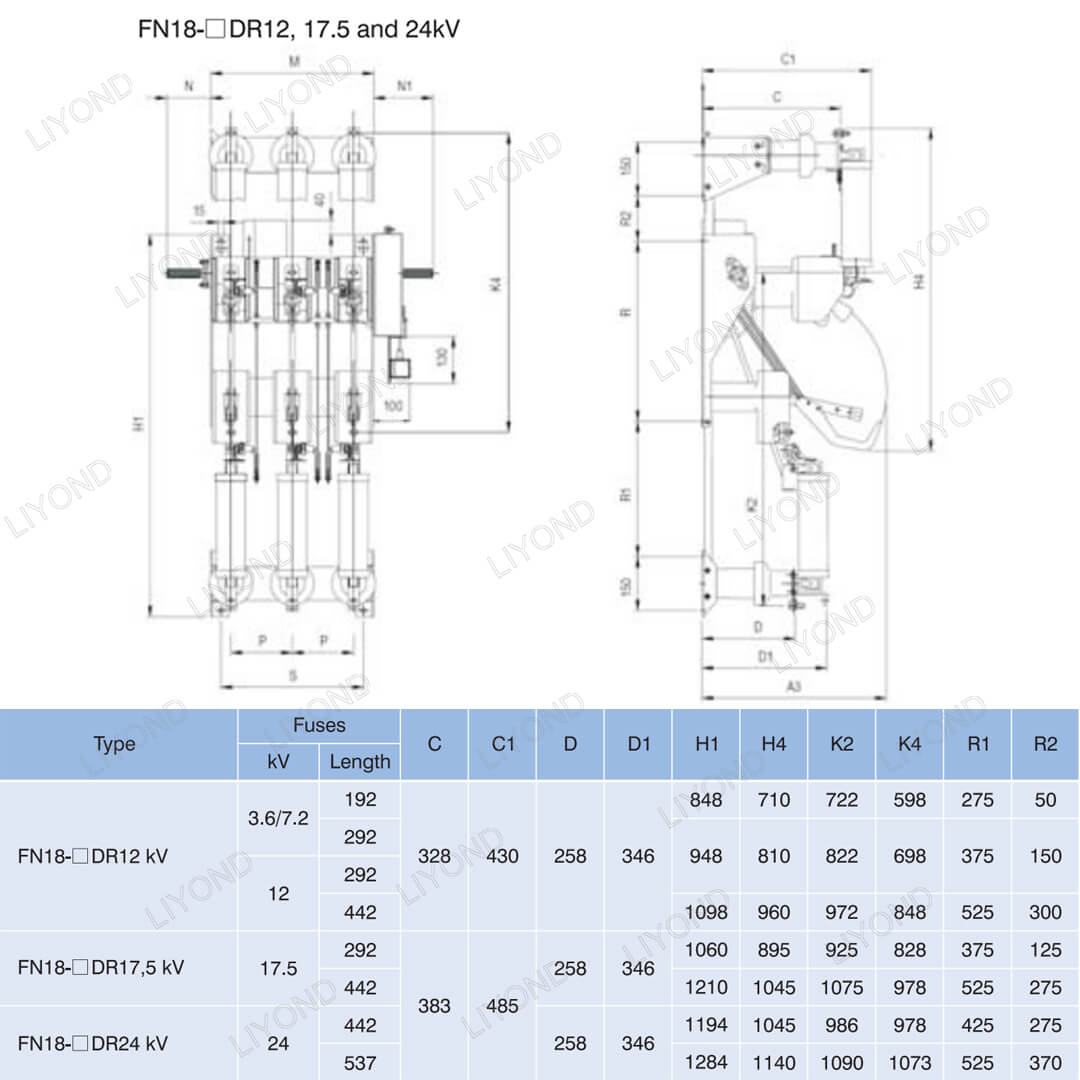 Ang FN18-D ay isang pangkalahatang layunin, tatlong-poste, load break switch na nag-aalok ng mga may-ari ng switchgear at nagtitipon ng mga pakinabang ng isang advanced na nakakagambalang teknolohiya at napatunayan, maaasahan na pagganap sa isang compact na disenyo. Ang switch ay magagamit sa mga nagtitipon ng switchgear bilang isang bloke ng gusali para sa metal-enclosed at pad-mount switchgear application sa mga rating mula sa 12-40.5 kV. Ang karaniwang switch ng FN18 ay nagsasama ng isang mabibigat na bakal na frame na may stand-off na mga insulators, isang natatanging sistema ng pag-iwas ng puffer-type na arc, isang mekanismo ng operating at kasalukuyang mga nagdadala ng mga sangkap, kabilang ang mga nakakaintriga na uri ng blade na may mga bisagra ng cast at mga konektor ng panga. Ang mga opsyonal na accessory at tampok ay may kasamang iba't ibang mga operating handles, isang operator ng motor, switch ng pandiwang pantulong, isang aparato ng shunt trip, fuse base, mechanical fuse tripping, grounding switch, mechanical door interlocking at key interlocking.
