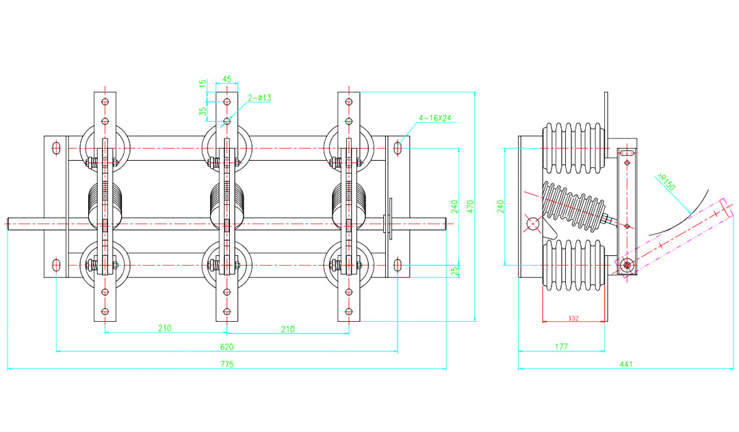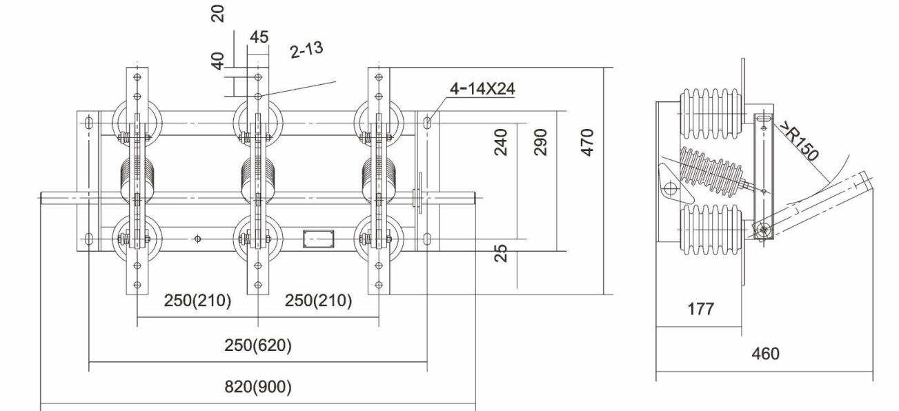 -Single-haligi na paghihiwalay ng switch: Direkta na gumamit ng vertical space sa ibaba ng overhead busbar bilang electrical pagkakabukod, pag-save ng puwang, pagbabawas ng pagkonekta ng mga conductor, at pagbibigay ng malinaw na mga estado ng pagkakakonekta, partikular na angkop para sa paghahatid ng ultra-high boltahe.