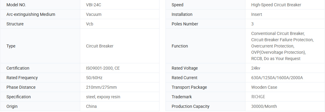 Ang VBI-24 medium boltahe vacuum circuit breaker ay isang uri ng panloob na daluyan ng boltahe na kagamitan sa switch na may 50Hz/60Hz tatlong phase AC 24KV rated boltahe, na pinagsama ang teknolohiya ng korporasyong ABB sa Switzerland at binuo sa China. Ang produkto ay sumusunod sa karaniwang GB1984 at IEC62271-100.