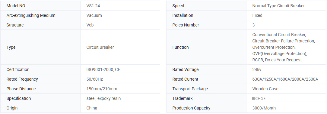 Ang serye ng VS1-24 ng panloob na mataas na boltahe na vacuum circuit breaker na may naka-embed na mga poste ay tatlong pariralang A.C.50 Hz panloob na kagamitan sa pamamahagi ng kuryente na may na-rate na boltahe na 24 kV. Ginagamit ito para sa pagprotekta at pagkontrol sa mga de -koryenteng kagamitan sa larangan ng industriya at pagmimina ng negosyo, mga halaman ng kuryente at substation. Ang pangunahing conductive circuit ng ganitong uri ng vacuum circuit breaker na may mekanismo ng tagsibol ay naka-embed na poste, na maaaring mapabuti ang pagiging maaasahan ng pagkakabukod, mekanikal at pagsira sa pagganap at talagang napagtanto ang libreng pagpapanatili at mas mahaba ang mekanikal at elektrikal na buhay.Ang uri ng vacuum circuit breaker ay umaayon sa pambansang pamantayan at ang mga stipulasyon ng pamantayan ng IEC. Ang kakayahan ay umabot sa grado ng M-E2-C2. Ang produkto ay ginagamit para sa maraming uri ng switchgear tulad ng Kyn28-24 (GZS1) at maaaring maayos na pag-install.