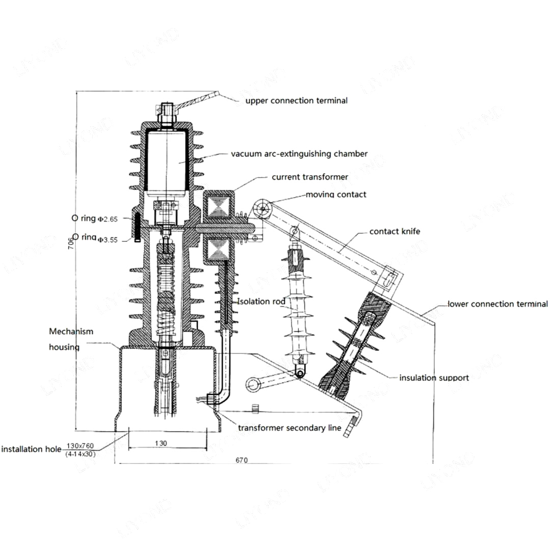 Ang paglabas ng pagkakabukod ng vacuum interrupter ay nagpatibay ng silicone goma casing, na may mas mahabang buhay, mas mataas na pagiging maaasahan, magandang paglaban sa panahon, maginhawa para sa transportasyon, mahusay na rating. Ang mekanismo ng operating ay nagpatibay ng miniaturization, mataas na maaasahang mekanismo ng operasyon ng tagsibol, ay may mga pakinabang ng simpleng istraktura, mekanikal na buhay hanggang sa 10000 beses.